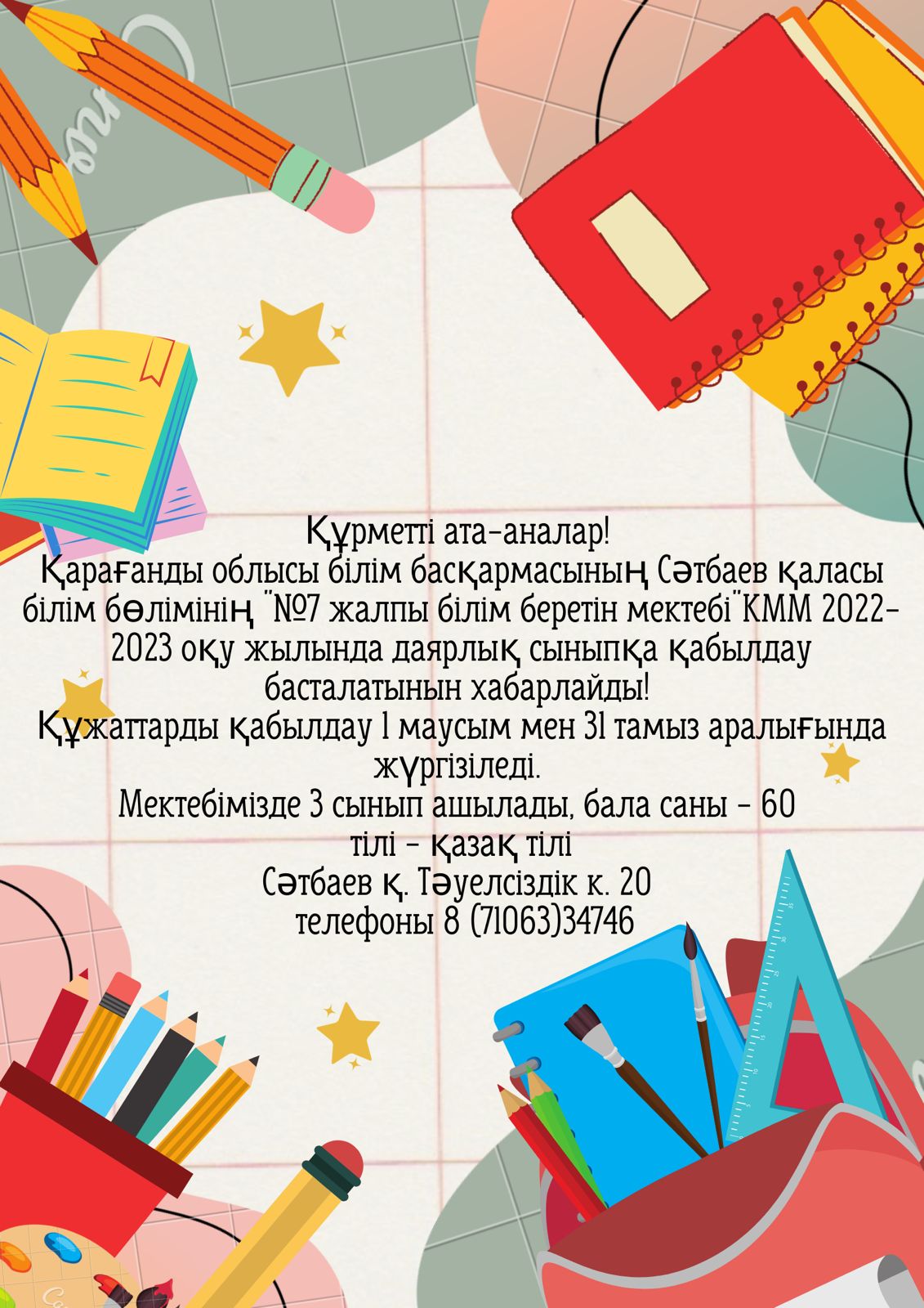 Қарағанды облысы білім басқармасының Сәтбаев қаласы білім бөлімінің "№7 жалпы білім беретін мектебі" КММ 2022-2023 оқу жылында даярлық сыныпқа қабылдау басталатынын хабарлайды! Құжаттарды қабылдау 1 маусым мен 31 тамыз аралығында жүргізіледі. Мектебімізде 3 сынып ашылады, бала саны - 60 оқыту тілі - қазақ тілі Сәтбаев қ. Тәуелсіздік к. 20 Байланыс телефоны 8 (71063)34746